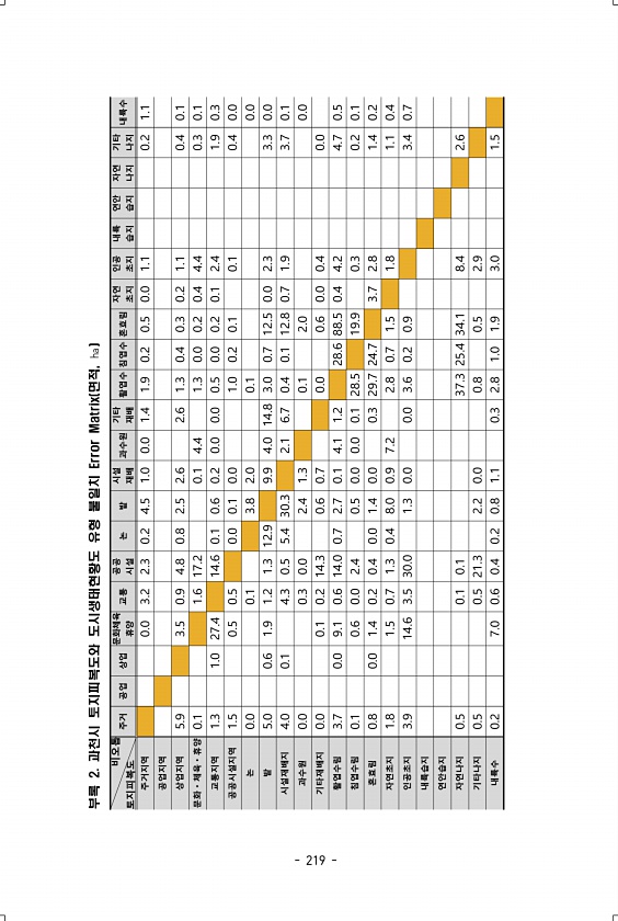 비오톱 토지피복도 주거 공업 상업 문화체육 휴양 교통 공공 시설 논 밭 시설 재배 과수원 기타 재배 활엽수 침엽수 혼효림 자연 초지 인공 초지 내륙 습지 연안 습지 자연 나지 기타 나지 내륙수 주거지역 0.0 3.2 2.3 0.2 4.5 1.0 0.0 1.4 1.9 0.2 0.5 0.0 1.1 0.2 1.1 공업지역 상업지역 5.9 3.5 0.9 4.8 0.8 2.5 2.6 2.6 1.3 0.4 0.3 0.2 1.1 0.4 0.1 문화ㆍ체육ㆍ휴양 0.1 1.6 17.2 0.1 4.4 1.3 0.0 0.2 0.4 4.4 0.3 0.1 교통지역 1.3 1.0 27.4 14.6 0.1 0.6 0.2 0.0 0.0 0.5 0.0 0.2 0.1 2.4 1.9 0.3 공공시설지역 1.5 0.5 0.5 0.0 0.1 0...