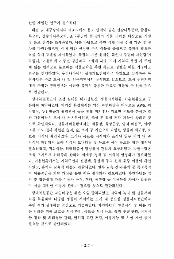 관련 세밀한 연구가 필요하다. 대전 및 대구광역시의 대조지에서 분포 면적이 넓은 신갈나무군락, 굴참나 무군락, 상수리나무군락, 소나무군락 등 4개의 식물 군락을 대상으로 식생 및 분포 간격을 조사하였다. 이를 바탕으로 복원 식재 식물 선정 기준 및 절 차를 마련하였으며, 이에 따라 선정한 주요 식물을 중심으로 복원에 필요한 식물 식재 모델을 제시하였다. 복원의 기본 원칙인 훼손지 주변의 자연림 이 차림 을 모델로 하고 주변 경관과의 조화에 따라, 도시 지역의 복원 시 주변 에 넓은 면적으로 분포하는 식물군락을 복원 목표로 정했을 때를 가정하고 연구를 진행하였다. 우리나라에서 생태계보전협력금 사업으로 실시하는 복 원사업은 주로 도시 내 및 인근지역에서 실시되고 있으므로, 도시 주변지역 에서 수집한 생태정보는 ...