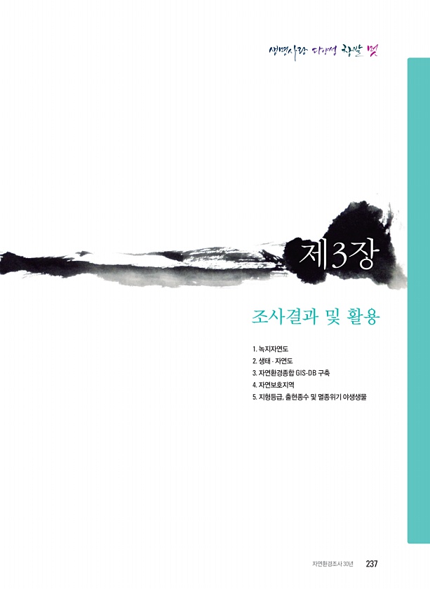 제3장 조사결과 및 활용 자연환경조사 30년 237 1. 녹지자연도 2. 생태 · 자연도 3. 자연환경종합 GIS-DB 구축 4. 자연보호지역 5. 지형등급, 출현종수 및 멸종위기야생생물
