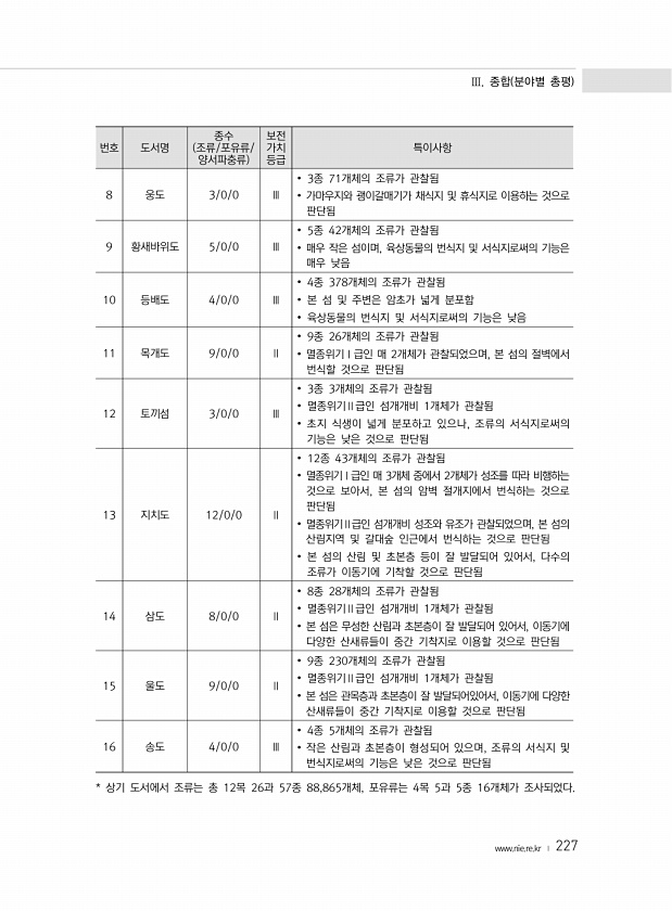 Ⅲ. 종합 분야별 총평 www.nie.re.kr ? 227 번호 도서명 종수 조류/포유류/ 양서파충류 보전 가치 등급 특이사항 8 웅도 3/0/0 Ⅲ ? 3종 71개체의 조류가 관찰됨 ? 가마우지와 괭이갈매기가 채식지 및 휴식지로 이용하는 것으로 판단됨 9 황새바위도 5/0/0 Ⅲ ? 5종 42개체의 조류가 관찰됨 ? 매우 작은 섬이며, 육상동물의 번식지 및 서식지로써의 기능은 매우 낮음 10 등배도 4/0/0 Ⅲ ? 4종 378개체의 조류가 관찰됨 ? 본 섬 및 주변은 암초가 넓게 분포함 ? 육상동물의 번식지 및 서식지로써의 기능은 낮음 11 목개도 9/0/0 Ⅱ ? 9종 26개체의 조류가 관찰됨 ? 멸종위기Ⅰ급인 매 2개체가 관찰되었으며, 본 섬의 절벽에서 번식할 것으로 판단됨 12 토끼섬 3/0/0 Ⅲ...