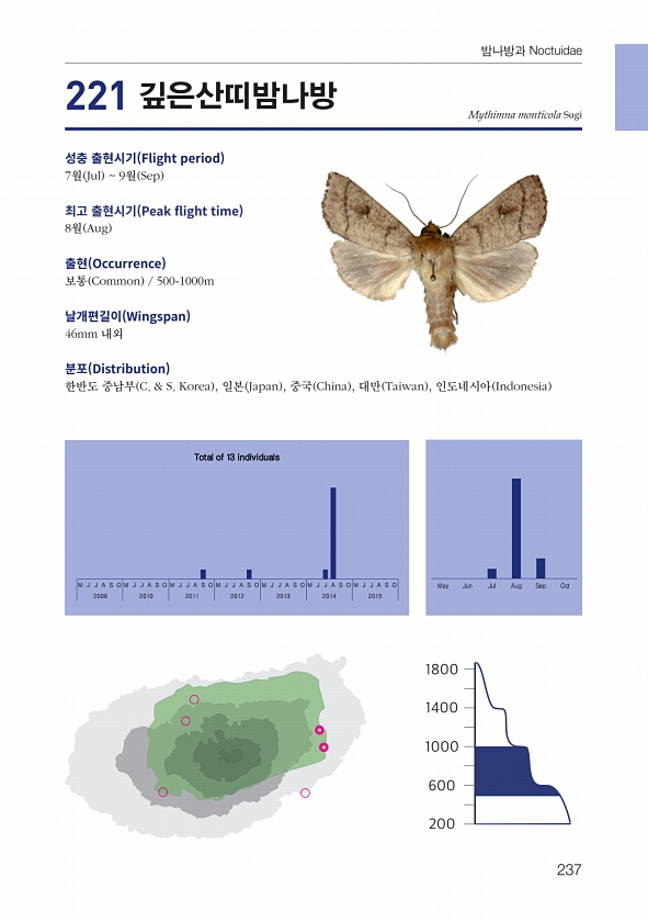 237 밤나방과 Noctuidae Mythimna monticola Sugi 성충 출현시기 Flight period 7월 Jul 9월 Sep 최고 출현시기 Peak fight time 8월 Aug 출현 Occurrence 보통 Common 500-1000m 날개편길이 Wingspan 46mm 내외 분포 Distribution 한반도 중남부 C. & S. Korea , 일본 Japan , 중국 China , 대만 Taiwan , 인도네시아 Indonesia 221 깊은산띠밤나방 M J J A S O M J J A S O M J J A S O M J J A S O M J J A S O M J J A S O M J J A S O May Jun Jul Aug Sep Oct 2009 2010 2011 2012 201...
