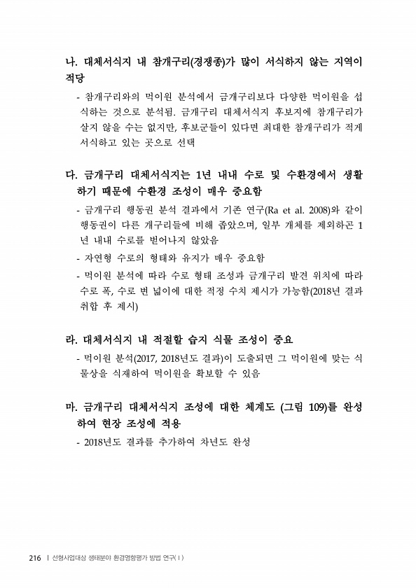 나 대체서식지 내 참개구리 경쟁종 가 많이 서식하지 않는 지역이 적당 참개구리와의 먹이원 분석에서 금개구리보다 다양한 먹이원을 섭 식하는 것으로 분석됨 금개구리 대체서식지 후보지에 참개구리가 살지 않을 수는 없지만 후보군들이 있다면 최대한 참개구리가 적게 서식하고 있는 곳으로 선택 다 금개구리 대체서식지는 년 내내 수로 및 수환경에서 생활 하기 때문에 수환경 조성이 매우 중요함 금개구리 행동권 분석 결과에서 기존 연구 와 같이 행동권이 다른 개구리들에 비해 좁았으며 일부 개체를 제외하곤 년 내내 수로를 벋어나지 않았음 자연형 수로의 형태와 유지가 매우 중요함 먹이원 분석에 따라 수로 형태 조성과 금개구리 발견 위치에 따라 수로 폭 수로 변 넓이에 대한 적정 수치 제시가 가능함 년 결과 취합 후 제시 라 대체...