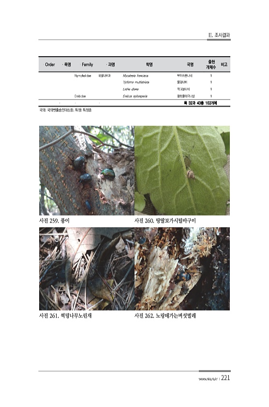 II. 조사결과 www.nie.re.kr ?221 사진 259. 풍이 사진 260. 땅딸보가시털바구미 사진 261. 썩덩나무노린재 사진 262. 노랑테가는버섯벌레 Order 목명 Family 과명 학명 국명 출현 개체수 비고 Nymphalidae 네발나비과 Mycalesis francisca 부처사촌나비 1 Ypthima multistriata 물결나비 1 Lethe diana 먹그늘나비 1 Erebidae Erebus ephesperis 왕흰줄태극나방 1 목 32과 43종 102개체 국외국외반출승인대상종; 특정특정종