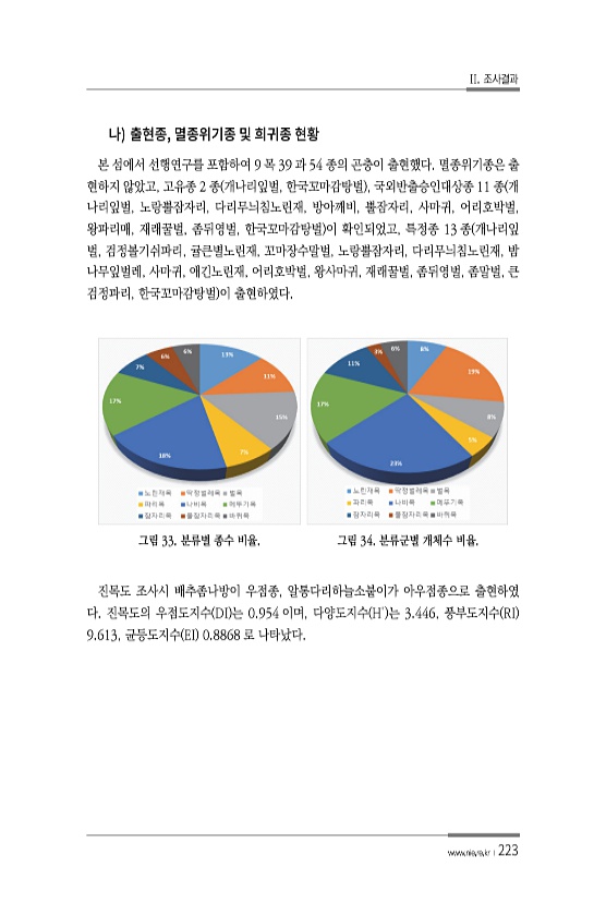 II. 조사결과 www.nie.re.kr ?223 , 본 섬에서 선행연구를 포함하여 9 목 39 과 54 종의 곤충이 출현했다. 멸종위기종은 출 현하지 않았고, 고유종 2 종 개나리잎벌, 한국꼬마감탕벌 , 국외반출승인대상종 11 종 개 나리잎벌, 노랑뿔잠자리, 다리무늬침노린재, 방아깨비, 뿔잠자리, 사마귀, 어리호박벌, 왕파리매, 재래꿀벌, 좀뒤영벌, 한국꼬마감탕벌 이 확인되었고, 특정종 13 종 개나리잎 벌, 검정볼기쉬파리, 귤큰별노린재, 꼬마장수말벌, 노랑뿔잠자리, 다리무늬침노린재, 밤 나무잎벌레, 사마귀, 애긴노린재, 어리호박벌, 왕사마귀, 재래꿀벌, 좀뒤영벌, 좀말벌, 큰 검정파리, 한국꼬마감탕벌 이 출현하였다. 그림 33. 분류별 종수 비율. 그림 34. 분류군별 개체수 비율. 진목도 조사시 배추좀...