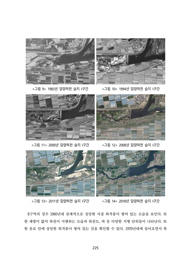 225 그림 9 1983년 담양하천 습지 I구간 그림 10 1994년 담양하천 습지 I구간 그림 11 2000년 담양하천 습지 I구간 그림 12 2008년 담양하천 습지 I구간 그림 13 2011년 담양하천 습지 I구간 그림 14 2018년 담양하천 습지 I구간 II구역의 경우 1960년대 전체적으로 상당한 사질 퇴적물이 쌓여 있는 모습을 보인다. 또 한 제방이 없어 하천이 사행하는 모습과 하중도, 바 등 다양한 지형 단위들이 나타난다. 또 한 유로 안에 상당한 퇴적물이 쌓여 있는 것을 확인할 수 있다. 1970년대에 들어오면서북