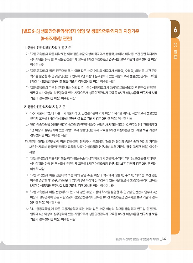 환경부 유전자변형생물체 안전관리 가이드 _237 6 별 표 3 [별표 9-5] 생물안전관리책임자 임명 및 생물안전관리자의 지정기준 9-9조제5항 관련 1. 생물안전관리책임자의 임명 기준 가. 「고등교육법」에 따른 대학 또는 이와 같은 수준 이상의 학교에서 생물학, 수의학, 의학 등 보건 관련 학과에서 석사학위를 취득 한 후 생물안전관리자 교육을 8시간 이상 3등급 연구시설 보유 기관의 경우 20시간 이상 이수한 사람 나. 「고등교육법」에 따른 전문대학 또는 이와 같은 수준 이상의 학교에서 생물학, 수의학, 의학 등 보건 관련 학과를 졸업한 후 연구실 안전관리 업무에 2년 이상의 실무경력이 있는 사람으로서 생물안전관리자 교육을 8시간 이상 3등급 연구시설 보유 기관의 경우 20시간 이상 이수한 사람 다. 「고...