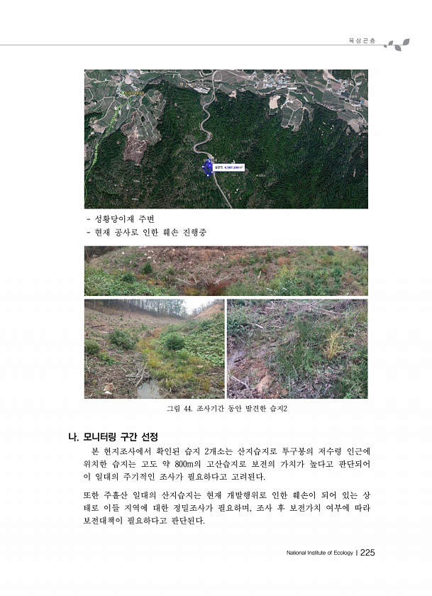 육 상 곤 충 National Institute of EcologyⅠ225 성황당이재 주변 현재 공사로 인한 훼손 진행중 그림 44. 조사기간 동안 발견한 습지2 나. 모니터링 구간 선정 본 현지조사에서 확인된 습지 2개소는 산지습지로 투구봉의 저수령 인근에 위치한 습지는 고도 약 800m의 고산습지로 보전의 가치가 높다고 판단되어 이 일대의 주기적인 조사가 필요하다고 고려된다. 또한 주흘산 일대의 산지습지는 현재 개발행위로 인한 훼손이 되어 있는 상 태로 이들 지역에 대한 정밀조사가 필요하며, 조사 후 보전가치 여부에 따라 보전대책이 필요하다고판단된다.