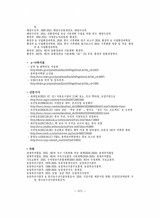 875 원. 해양수산부. 1990-2015. 해양수산통계연보. 해양수산부. 해양수산부. 2014. 친환경어업 육성 기본계획 수립을 위한 연구. 해양수산부. 환경부. 1992-2015. 가축분뇨처리통계. 환경부. 환경부 & 국립환경과학원. 2010. 한국 기후변화 평가 보고서 2010. 환경부 & 국립환경과학원. 환경부 & 국립환경과학원. 2014. 한국 기후변화 평가보고서 2014; 기후변화 영향 및 적응. 환경 부 & 국립환경과학원. 환경부. 2017a. 제2차 물환경관리 기본계획. 환경부. 환경부. 2017b. 제2차 물환경관리 기본계획 ‘16-’25 부록. 환경부 물환경정책국. ? e-나라지표 농약 및 화학비료 사용량 http//index.go.kr/potal/main/EachDtlPageDetail....