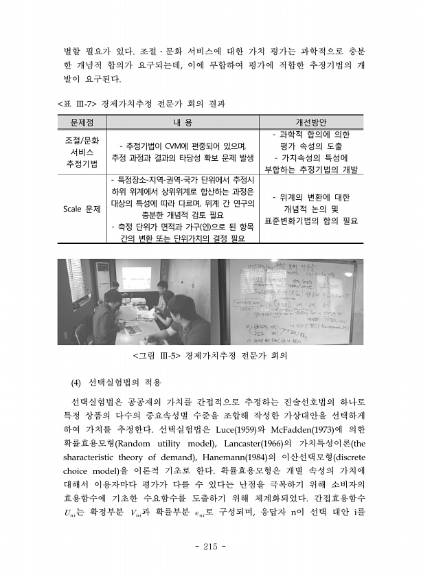 215 별할 필요가 있다 조절 문화 서비스에 대한 가치 평가는 과학적으로 충분 한 개념적 합의가 요구되는데 이에 부합하여 평가에 적합한 추정기법의 개 발이 요구된다 문제점 내 용 개선방안 조절/문화 서비스 추정기법 추정기법이 CVM에 편중되어 있으며, 추정 과정과 결과의 타당성 확보 문제 발생 과학적 합의에 의한 평가 속성의 도출 가치속성의 특성에 부합하는 추정기법의 개발 Scale 문제 특정장소-지역-권역-국가 단위에서 추정시 하위 위계에서 상위위계로 합산하는 과정은 대상의 특성에 따라 다르며, 위계 간 연구의 충분한 개념적 검토 필요 측정 단위가 면적과 가구 인 으로 된 항목 간의 변환 또는 단위가치의 결정 필요 위계의 변환에 대한 개념적 논의 및 표준변화기법의 합의 필요 표 경제가치추정 전문가 회의 결...