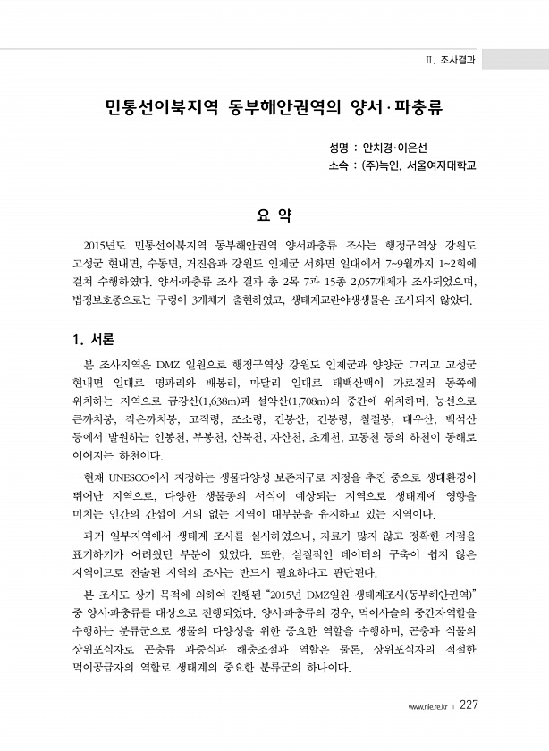 Ⅱ. 조사결과 www.nie.re.kr ? 227 민통선이북지역 동부해안권역의 양서 ? 파충류 성명 안치경·이은선 소속 주 녹인, 서울여자대학교 요 약 2015년도 민통선이북지역 동부해안권역 양서파충류 조사는 행정구역상 강원도 고성군 현내면, 수동면, 거진읍과 강원도 인제군 서화면 일대에서 79월까지 12회에 걸쳐 수행하였다. 양서?파충류 조사 결과 총 2목 7과 15종 2,057개체가 조사되었으며, 법정보호종으로는 구렁이 3개체가 출현하였고, 생태계교란야생생물은 조사되지 않았다. 1. 서론 본 조사지역은 DMZ 일원으로 행정구역상 강원도 인제군과 양양군 그리고 고성군 현내면 일대로 명파리와 배봉리, 마달리 일대로 태백산맥이 가로질러 동쪽에 위치하는 지역으로 금강산 1,638m 과 설악산 1,708m 의 중...