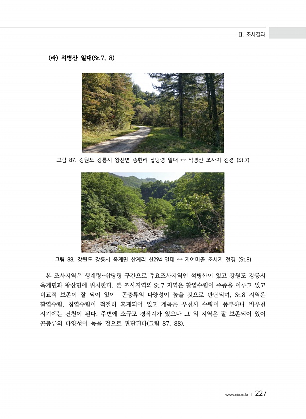 Ⅱ. 조사결과 www.nie.re.kr ? 227 라 석병산 일대 St.7, 8 그림 87. 강원도 강릉시 왕산면 송현리 삽당령 일대 ↔ 석병산 조사지 전경 St.7 그림 88. 강원도 강릉시 옥계면 산계리 산294 일대 ↔ 지어미골 조사지 전경 St.8 본 조사지역은 생계령삽당령 구간으로 주요조사지역인 석병산이 있고 강원도 강릉시 옥계면과 왕산면에 위치한다. 본 조사지역의 St.7 지역은 활엽수림이 주종을 이루고 있고 비교적 보존이 잘 되어 있어 곤충류의 다양성이 높을 것으로 판단되며, St.8 지역은 활엽수림, 침엽수림이 적절히 혼재되어 있고 계곡은 우천시 수량이 풍부하나 비우천 시기에는 건천이 된다. 주변에 소규모 경작지가 있으나 그 외 지역은 잘 보존되어 있어 곤충류의 다양성이 높을 것으로 판단된다 ...