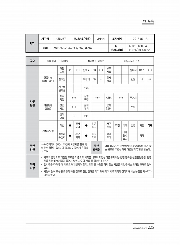 VI. 부 록 www.nie.re.kr ?225 지역 사구명 대광사구 조사번호 기호 JN-i4 조사일자 2018.07.13 위치 전남 신안군 임자면 광산리, 대기리 좌표 중심좌표 N 35°06′09.49″ E 126°04′08.22″ 규모 최대길이 1,610m 최대폭 790m 해발고도 17 사구 현황 인공시설 정의, 강도 해안 도로 A1 +++ 산책로 B0 +++ 부두 시설 방파제 D1.1 +++ 철조망 도류제 F0 + 돌제 제티 건물 H ++ 사구복 원시설 기타 이용현황 강도 해수 욕장 +++ 삼림 욕장 +++ 농경지 +++ 주거지 상업 시설 +++ 골재 채취 군사 훈련지 무덤 생태 교육 + 기타 서식지유형 해빈 ● 전사 구열 ● 이동 사구 사구 초지 자연 식재 삼림 자연 식재 배후담 수습지 ● 사구 저지...