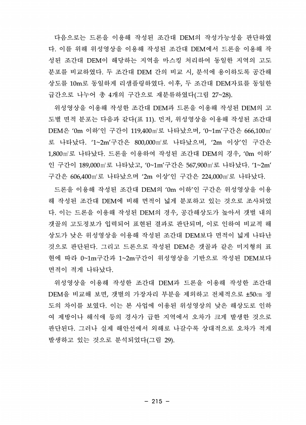 215 다음으로는 드론을 이용해 작성된 조간대 DEM의 작성가능성을 판단하였 다. 이를 위해 위성영상을 이용해 작성된 조간대 DEM에서 드론을 이용해 작 성된 조간대 DEM이 해당하는 지역을 마스킹 처리하여 동일한 지역의 고도 분포를 비교하였다. 두 조간대 DEM 간의 비교 시, 분석에 용이하도록 공간해 상도를 10m로 동일하게 리샘플링하였다. 이후, 두 조간대 DEM자료를 동일한 급간으로 나누어 총 4개의 구간으로 재분류하였다 그림 2728 위성영상을 이용해 작성한 조간대 DEM과 드론을 이용해 작성된 DEM의 고 도별 면적 분포는 다음과 같다 표 11 먼저, 위성영상을 이용해 작성된 조간대 DEM은 ‘0m 이하’인 구간이 119,400㎡로 나타났으며, ‘01m’구간은 666,100㎡ 로 나타났다. ‘12...