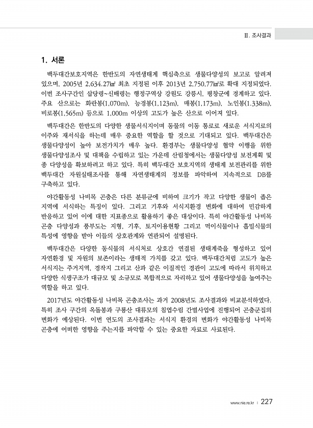 Ⅱ. 조사결과 www.nie.re.kr ? 227 1. 서론 백두대간보호지역은 한반도의 자연생태계 핵심축으로 생물다양성의 보고로 알려져 있으며, 2005년 2,634.27㎢ 최초 지정된 이후 2013년 2,750,77㎢로 확대 지정되었다. 이번 조사구간인 삽당령신배령는 행정구역상 강원도 강릉시, 평창군에 경계하고 있다. 주요 산으로는 화란봉 1,070m , 능경봉 1,123m , 매봉 1,173m , 노인봉 1.338m , 비로봉 1,565m 등으로 1,000m 이상의 고도가 높은 산으로 이어져 있다. 백두대간은 한반도의 다양한 생물서식지이며 동물의 이동 통로로 새로운 서식지로의 이주와 재서식을 하는데 매우 중요한 역할을 할 것으로 기대되고 있다. 백두대간은 생물다양성이 높아 보전가치가 매우 높다. 환경부는...