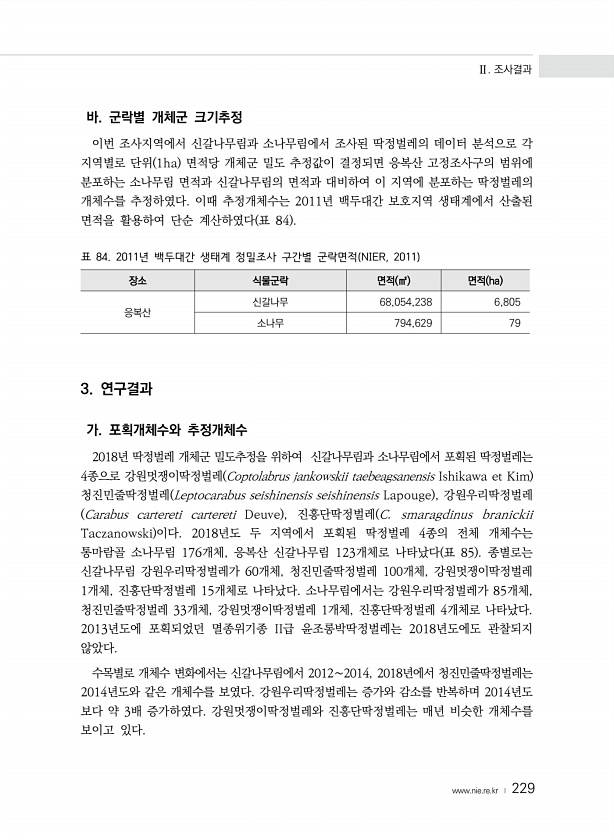 Ⅱ. 조사결과 www.nie.re.kr ? 229 바. 군락별 개체군 크기추정 이번 조사지역에서 신갈나무림과 소나무림에서 조사된 딱정벌레의 데이터 분석으로 각 지역별로 단위 1ha 면적당 개체군 밀도 추정값이 결정되면 응복산 고정조사구의 범위에 분포하는 소나무림 면적과 신갈나무림의 면적과 대비하여 이 지역에 분포하는 딱정벌레의 개체수를 추정하였다. 이때 추정개체수는 2011년 백두대간 보호지역 생태계에서 산출된 면적을 활용하여 단순 계산하였다 표 84 표 84. 2011년 백두대간 생태계 정밀조사 구간별 군락면적 NIER, 2011 장소 식물군락 면적 ㎡ 면적 ha 응복산 신갈나무 68,054,238 6,805 소나무 794,629 79 3. 연구결과 가. 포획개체수와 추정개체수 2018년 딱정벌레 개체군 ...