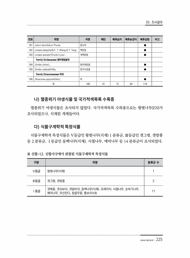 III. 조사결과 www.nie.re.kr ?225 멸종위기 야생식물은 조사되지 않았다. 국가적색목록 수록종으로는 왕벚나무 EN 가 조사되었으나, 식재된 개체들이다. 식물구계학적 특정식물은 Ⅴ등급인 왕벚나무 식재 1 분류군, Ⅲ등급인 갯그령, 갯방풍 등 2 분류군, Ⅰ등급인 동백나무 식재 , 사철나무, 예덕나무 등 14 분류군이 조사되었다. 구분 국명 분류군 수 Ⅴ등급 왕벚나무 식재 1 Ⅲ등급 갯그령, 갯방풍 2 Ⅰ등급 갯메꽃, 갯쇠보리, 갯씀바귀, 동백나무 식재 , 모래지치, 사철나무, 순비기나무, 예덕나무, 우산잔디, 참골무꽃, 통보리사초 11 표 신합-12. 신합사구에서 관찰된 식물구계학적 특정식물 번호 학명 국명 해빈 배후습지 배후농경지 배후삼림 비고 181 Lilium lancifolium Thun...