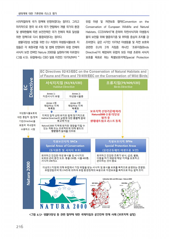 생태계에 대한 기후변화 리스크 평가 216 시의적절하게 국가 정책에 반영하였다는 점이다. 그리고 마지막으로 영국 내 4개 국가 연합에서 개별 국가의 환경 및 생태현황에 따른 보전전략은 국가 전체의 목표 달성을 위한 정책으로 다시 통합되었다는 점이다. 생물다양성 보전을 위한 EU 차원의 야생동식물보호 지 침들은 각 회원국별 지침 및 법에 반영되어 유럽 전체의 서식지 보전 전략인 Natura 2000을 실현하기에 이르렀다 그림 4.5 유럽에서는 CBD 발효 이전인 1979년부터 “유럽 야생 및 자연보호 협약 Convention on the Conservation of European Wildlife and Natural Habitats, CCEWNH ”에 준하여 자연서식지와 야생동식 물의 보전을 위해 멸종위기종...