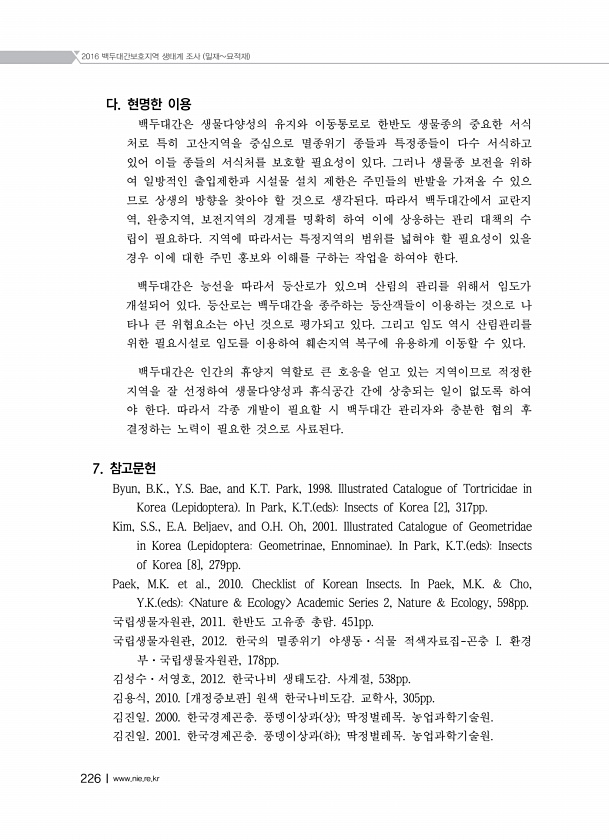 2016 백두대간보호지역 생태계 조사 밀재묘적재 226Ⅰwww.nie.re.kr 다. 현명한 이용 백두대간은 생물다양성의 유지와 이동통로로 한반도 생물종의 중요한 서식 처로 특히 고산지역을 중심으로 멸종위기 종들과 특정종들이 다수 서식하고 있어 이들 종들의 서식처를 보호할 필요성이 있다. 그러나 생물종 보전을 위하 여 일방적인 출입제한과 시설물 설치 제한은 주민들의 반발을 가져올 수 있으 므로 상생의 방향을 찾아야 할 것으로 생각된다. 따라서 백두대간에서 교란지 역, 완충지역, 보전지역의 경계를 명확히 하여 이에 상응하는 관리 대책의 수 립이 필요하다. 지역에 따라서는 특정지역의 범위를 넓혀야 할 필요성이 있을 경우 이에 대한 주민 홍보와 이해를 구하는 작업을 하여야 한다. 백두대간은 능선을 따라서 등산로가...