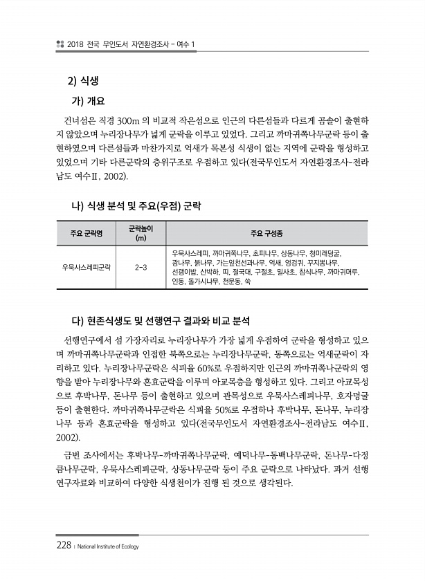 2018 전국 무인도서 자연환경조사 여수 1 228 ? National Institute of Ecology 2 건너섬은 직경 300m 의 비교적 작은섬으로 인근의 다른섬들과 다르게 곰솔이 출현하 지 않았으며 누리장나무가 넓게 군락을 이루고 있었다. 그리고 까마귀쪽나무군락 등이 출 현하였으며 다른섬들과 마찬가지로 억새가 목본성 식생이 없는 지역에 군락을 형성하고 있었으며 기타 다른군락의 층위구조로 우점하고 있다 전국무인도서 자연환경조사-전라 남도 여수Ⅱ, 2002 주요 군락명 군락높이 m 주요 구성종 우묵사스레피군락 2-3 우묵사스레피, 까마귀쪽나무, 초피나무, 상동나무, 청미래덩굴, 광나무, 붉나무, 가는잎천선과나무, 억새, 엉겅퀴, 꾸지뽕나무, 선괭이밥, 산박하, 띠, 절국대, 구절초, 밀사초, 참식나무...
