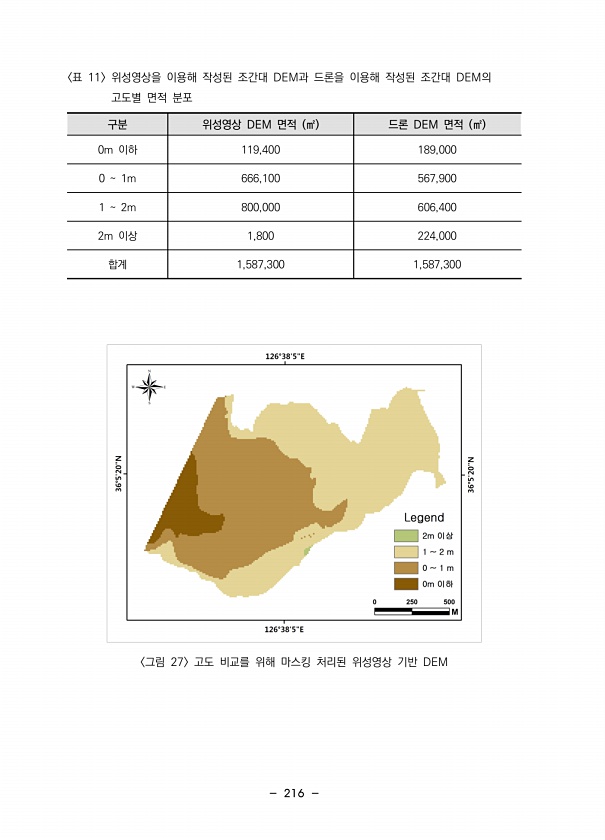 216 구분 위성영상 DEM 면적 ㎡ 드론 DEM 면적 ㎡ 0m 이하 119,400 189,000 0 1m 666,100 567,900 1 2m 800,000 606,400 2m 이상 1,800 224,000 합계 1,587,300 1,587,300 표 11 위성영상을 이용해 작성된 조간대 DEM과 드론을 이용해 작성된 조간대 DEM의 고도별 면적 분포 그림 27 고도 비교를 위해 마스킹 처리된 위성영상 기반DEM