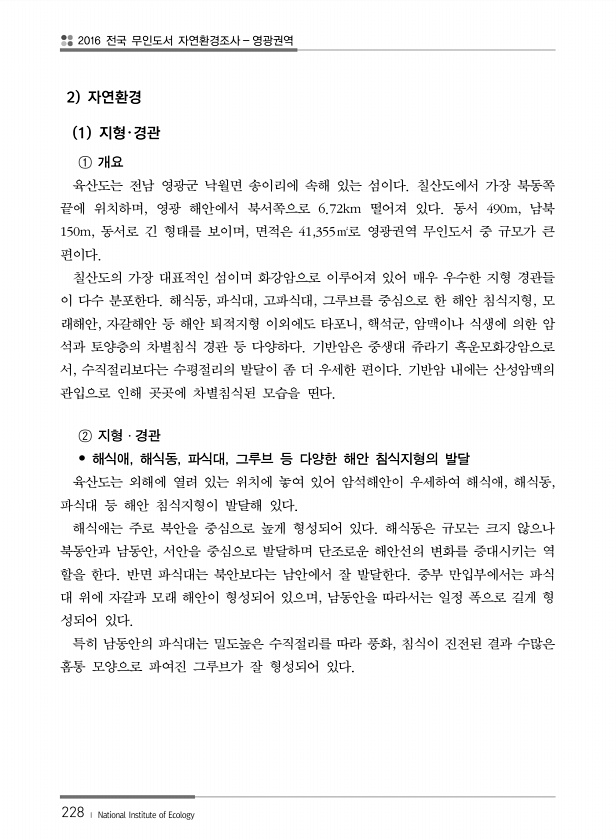 2016 전국 무인도서 자연환경조사 영광권역 228 ? National Institute of Ecology 2 자연환경 1 지형?경관 ① 개요 육산도는 전남 영광군 낙월면 송이리에 속해 있는 섬이다. 칠산도에서 가장 북동쪽 끝에 위치하며, 영광 해안에서 북서쪽으로 6.72km 떨어져 있다. 동서 490m, 남북 150m, 동서로 긴 형태를 보이며, 면적은 41,355㎡로 영광권역 무인도서 중 규모가 큰 편이다. 칠산도의 가장 대표적인 섬이며 화강암으로 이루어져 있어 매우 우수한 지형 경관들 이 다수 분포한다. 해식동, 파식대, 고파식대, 그루브를 중심으로 한 해안 침식지형, 모 래해안, 자갈해안 등 해안 퇴적지형 이외에도 타포니, 핵석군, 암맥이나 식생에 의한 암 석과 토양층의 차별침식 경관 등 다양하다....