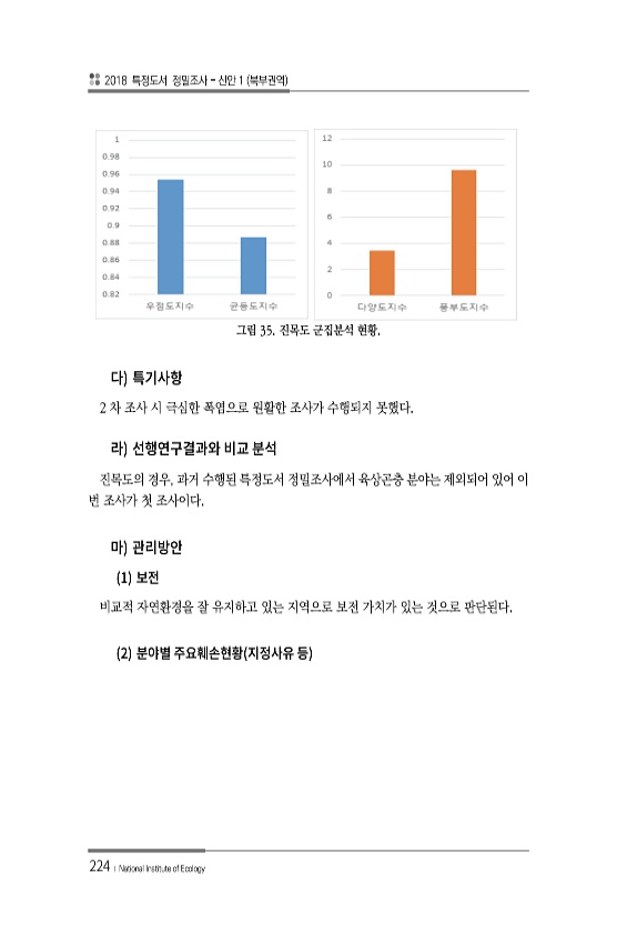 2018 특정도서 정밀조사 신안 1 북부권역 224 ? National Institute of Ecology 그림 35. 진목도 군집분석 현황. 2 차 조사 시 극심한 폭염으로 원활한 조사가 수행되지 못했다. 진목도의 경우, 과거 수행된 특정도서 정밀조사에서 육상곤충 분야는 제외되어 있어 이 번 조사가 첫 조사이다. 1 비교적 자연환경을 잘 유지하고 있는 지역으로 보전 가치가 있는 것으로 판단된다. 2