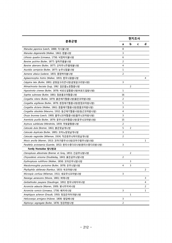 212 분류군명 현지조사 a b c d Manulea japonica Leech, 1888 각시불나방 8 Manulea degenerella Walker, 1863 흰불나방 3 Lithosia quadra Linnaeus, 1758 넉점박이불나방 6 Barsine pulchra Butler, 1877 알락주홍불나방 2 Barsine aberrans Butler, 1877 교차무늬주홍테불나방 4 Asuridia carnipicta Butler, 1877 눈무늬점불나방 1 Aemene altaica Lederer, 1855 좀점박이불나방 2 Aglaeomorpha histrio Walker, 1855 흰무늬왕불나방 4 Calyptra l...