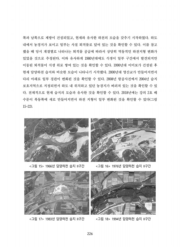 226 쪽과 남쪽으로 제방이 건설되었고, 현재와 유사한 하천의 모습을 갖추기 시작하였다. 하도 내에서 농경지가 보이고 일부는 사질 퇴적물로 덮여 있는 것을 확인할 수 있다. 이를 참고 했을 때 당시 계절별로 나타나는 퇴적물 공급에 따라서 상당히 역동적인 하천지형 변화가 있었을 것으로 추정된다. 이와 유사하게 1980년대에도 식생이 일부 구간에서 발견되지만 이동된 퇴적물이 식생 위로 쌓여 있는 것을 확인할 수 있다. 1990년대 이미보가 건설된 후 현재 담양하천 습지와 비슷한 모습이 나타나기 시작했다. 2000년대 영산교가 만들어지면서 다리 아래로 일부 경관이 변화된 것을 확인할 수 있다. 2008년 항공사진에서 2004년 습지 보호지역으로 지정되면서 하도 내 위치하고 있던 농경지가 버려져 있는 것을 확인할 ...