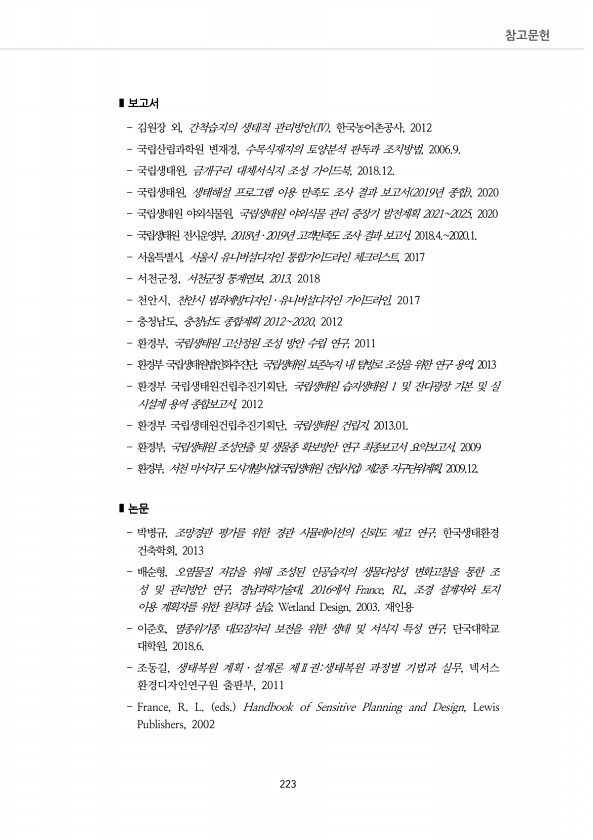 참고문헌 223 ?보고서 김원장 외, 간척습지의 생태적 관리방안 Ⅳ , 한국농어촌공사, 2012 국립산림과학원 변재경, 수목식재지의 토양분석 판독과 조치방법, 2006.9. 국립생태원, 금개구리 대체서식지 조성 가이드북, 2018.12. 국립생태원, 생태해설 프로그램 이용 만족도 조사 결과 보고서 2019년 종합 , 2020 국립생태원 야외식물원, 국립생태원 야외식물 관리 중장기 발전계획 20212025, 2020 국립생태원 전시운영부, 2018년ㆍ2019년 고객만족도 조사 결과 보고서, 2018.4.2020.1. 서울특별시, 서울시 유니버설디자인 통합가이드라인 체크리스트, 2017 서천군청, 서천군청 통계연보, 2013, 2018 천안시, 천안시 범죄예방디자인ㆍ유니버설디자인 가이드라인, 2017 충청남도,...