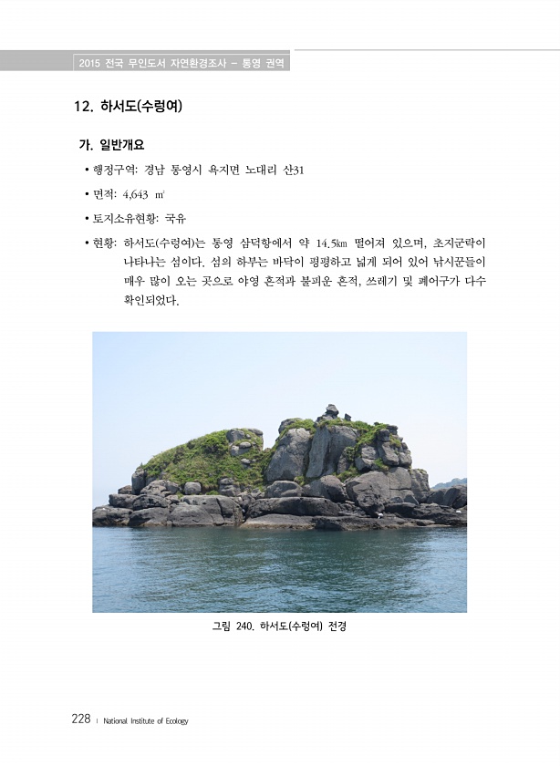 2015 전국 무인도서 자연환경조사 통영 권역 228 ? National Institute of Ecology 12. 하서도 수렁여 가. 일반개요 ? 행정구역경남 통영시 욕지면 노대리 산31 ? 면적4,643 ㎡ ? 토지소유현황국유 ? 현황하서도 수렁여 는 통영 삼덕항에서 약 14.5㎞ 떨어져 있으며, 초지군락이 나타나는 섬이다. 섬의 하부는 바닥이 평평하고 넓게 되어 있어 낚시꾼들이 매우 많이 오는 곳으로 야영 흔적과 불피운 흔적, 쓰레기 및 폐어구가 다수 확인되었다. 그림 240. 하서도 수렁여전경