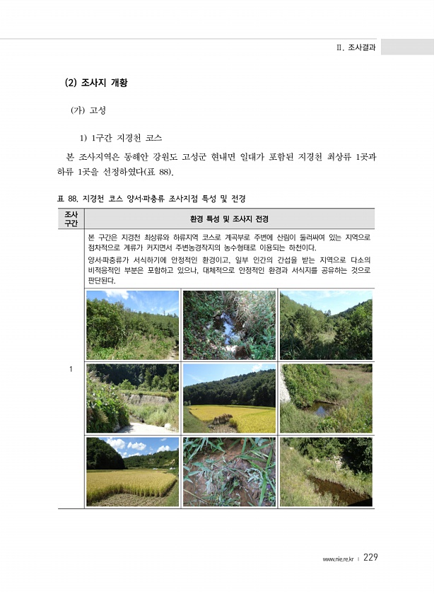 Ⅱ. 조사결과 www.nie.re.kr ? 229 2 조사지 개황 가 고성 1 1구간 지경천 코스 본 조사지역은 동해안 강원도 고성군 현내면 일대가 포함된 지경천 최상류 1곳과 하류 1곳을 선정하였다 표 88 표 88. 지경천 코스 양서?파충류 조사지점 특성 및 전경 조사 구간 환경 특성 및 조사지 전경 1 본 구간은 지경천 최상류와 하류지역 코스로 계곡부로 주변에 산림이 둘러싸여 있는 지역으로 점차적으로 계류가 커지면서 주변농경작지의 농수형태로 이용되는 하천이다. 양서?파충류가 서식하기에 안정적인 환경이고, 일부 인간의 간섭을 받는 지역으로 다소의 비적응적인 부분은 포함하고 있으나, 대체적으로 안정적인 환경과 서식지를 공유하는 것으로판단된다.
