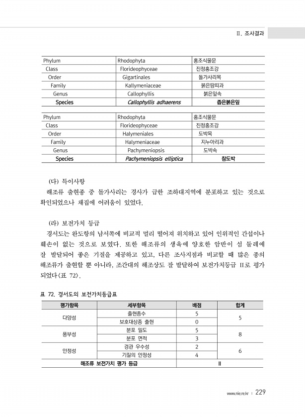 Ⅱ. 조사결과 www.nie.re.kr ? 229 Phylum Rhodophyta 홍조식물문 Class Florideophyceae 진정홍조강 Order Gigartinales 돌가사리목 Family Kallymeniaceae 붉은땀띠과 Genus Callophyllis 붉은잎속 Species Callophyllis adhaerens 좁은붉은잎 Phylum Rhodophyta 홍조식물문 Class Florideophyceae 진정홍조강 Order Halymeniales 도박목 Family Halymeniaceae 지누아리과 Genus Pachymeniopsis 도박속 Species Pachymeniopsis elliptica 참도박 다 특이사항 해조류 출현종 중 돌가사리는 경사가 급한 조하대지역에 분포하고 ...