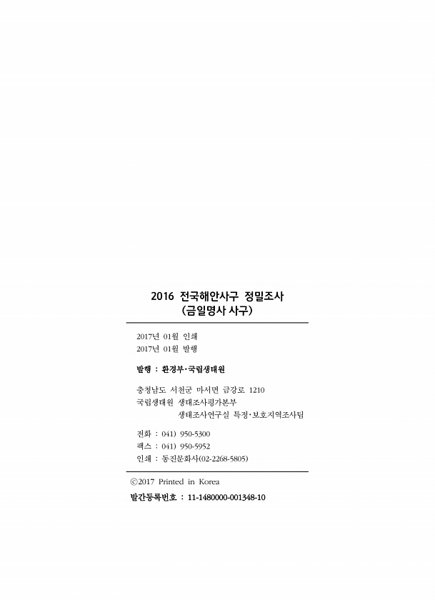 2016 전국해안사구 정밀조사 금일명사 사구 2017년 01월 인쇄 2017년 01월 발행 발행 환경부?국립생태원 충청남도 서천군 마서면 금강로 1210 국립생태원 생태조사평가본부 생태조사연구실 특정?보호지역조사팀 전화 041 950-5300 팩스 041 950-5952 인쇄 동진문화사 02-2268-5805 ⓒ2017 Printed in Korea 발간등록번호 11-1480000-001348-10