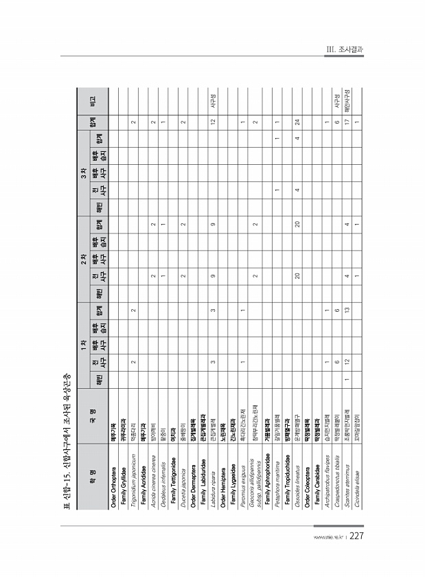 227 학 명 국 명 1 차 2 차 3 차 합계 비고 해빈 전 사구 배후 사구 배후 습지 합계 해빈 사구 전 배후 사구 배후 습지 합계 해빈 사구 전 배후 사구 배후 습지 합계 Order Orthoptera 메뚜기목 Family Gryllidae 귀뚜라미과 Trigonidium japonicum 먹종다리 2 2 2 Family Acrididae 메뚜기과 Acrida cinerea cinerea 방아깨비 2 2 2 Oedaleus infernalis 팥중이 1 1 1 Family Tettigonidae 여치과 Ducetia japonica 줄베짱이 2 2 2 Order Dermaptera 집게벌레목 Family Labiduridae 큰집게벌레과 Labidura riparia 큰집게벌레 3 3 9 9 12 사구...