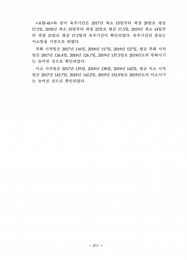 211 표Ⅲ-41 와 같이 육추기간은 2017년 최소 15일부터 최장 20일로 평균 17.3일, 2018년 최소 15일부터 최장 22일로 평균 17.3일, 2019년 최소 14일부 터 최장 21일로 평균 17.2일의 육추기간이 확인되었다. 육추기간의 종료는 이소일을 기준으로 하였다. 부화 시작일은 2017년 116일, 2018년 117일, 2019년 127일, 평균 부화 시작 일은 2017년 126.4일, 2018년 126.7일, 2019년 137.3일로 2019년도의 부화시기 는 늦어진 것으로 확인되었다. 이소 시작일은 2017년 135일, 2018년 138일, 2019년 142일, 평균 이소 시작 일은 2017년 142.7일, 2018년 142.2일, 2019년 152.9일로 2019년도의 이소시기 는 ...