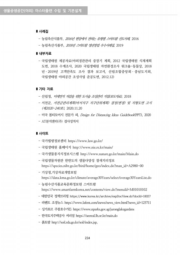 생물공생공간 야외 마스터플랜 수립 및 기본설계 224 ?사례집 농림축산식품부, 2016년 현장에서 전하는 유형별 스마트팜 선도사례, 2016 농림축산식품부, 2018년 스마트팜 청년창업 우수사례집, 2019 ?내부자료 국립생태원 제공자료 야외경관관리 중장기 계획, 2012 국립생태원 식재계획 도면, 2018 수계조사, 2020 국립생태원 자연환경조사 워크숍-동물상, 2018 년ㆍ2019년 고객만족도 조사 결과 보고서, 산림조합중앙회ㆍ충남도지회, 국립생태원 야외공간 조성사업 준공도면, 2012.12 ?기타 자료 산림청, 미세먼지 저감을 위한 도시숲 조성관리 지침 보도자료 , 2018 서천군, 서천군관리계획 마서지구 지구단위계획 결정 변경 및 지형도면 고시 제2020-240호 , 2020.11.20 미국 볼티모...