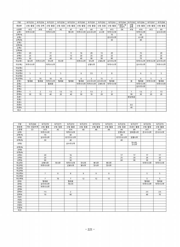 구분 숙지산55 숙지산56 숙지산57 숙지산58 숙지산59 숙지산60 숙지산61 숙지산62 숙지산63 숙지산64 숙지산65 숙지산66 숙지산67 숙지산68 중분류 산림 활엽 산림 관목 산림 활엽 산림 침엽 산림 활엽 산림 활엽 산림 활엽 산림 침엽 산림 활엽 시설지 및 포장지 산림 관목 산림 활엽 산림 활엽 산림 활엽 소분류 A13 A18 A13 A5 A7 A13 A9 A3 A15 D6 A18 A16 A13 A9 교목1 아까시나무 아까시나무 벚나무 아까시나무 상수리나무 소나무 아까시나무 아까시나무 상수리나무 교목1% 70 60 교목2 상수리나무 소나무 교목2% 30 40 교목3 교목3% 교목4 교목4% 교목H 20 17 9 16 20 13 20 15 20 교목D 25 25 13 20 25 20 25 20 2...
