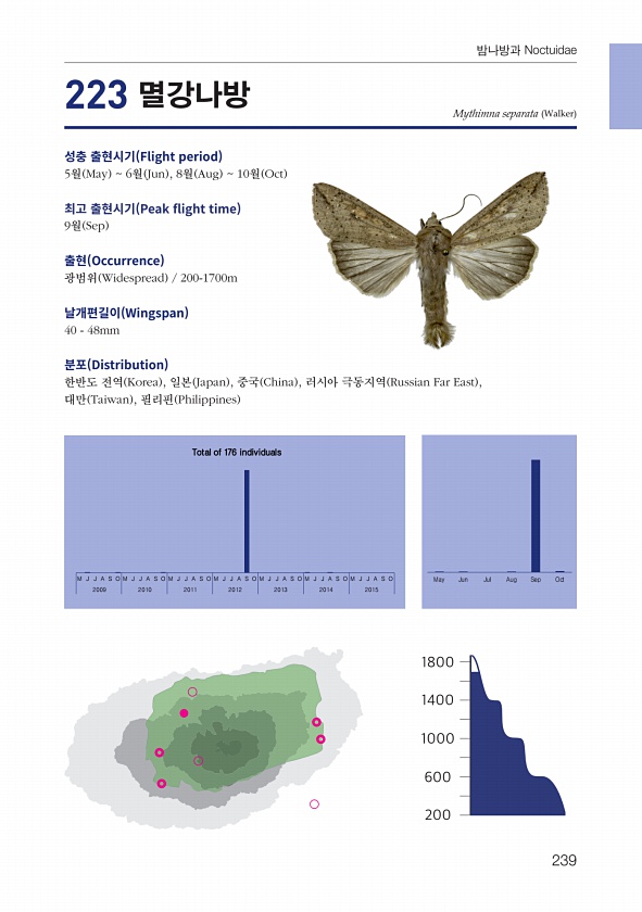 239 밤나방과 Noctuidae Mythimna separata Walker 성충 출현시기 Flight period 5월 May 6월 Jun , 8월 Aug 10월 Oct 최고 출현시기 Peak fight time 9월 Sep 출현 Occurrence 광범위 Widespread 200-1700m 날개편길이 Wingspan 40 48mm 분포 Distribution 한반도 전역 Korea , 일본 Japan , 중국 China , 러시아 극동지역 Russian Far East , 대만 Taiwan , 필리핀 Philippines 223 멸강나방 M J J A S O M J J A S O M J J A S O M J J A S O M J J A S O M J J A S O M J J A S O May Jun ...