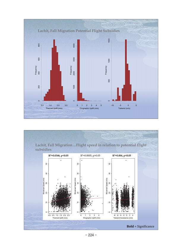 0.0 0.5 1.0 1.5 2.0 2.5 0 10 20 30 40 50 Thermal Uplift m/s Movement Speed m/s 0 1 2 3 4 0 10 20 30 40 50 Orographic Uplift m/s Movement Speed m/s -8 -6 -4 -2 0 2 4 0 10 20 30 40 50 Tailwind Assistance m/s Movement Speed m/s Lachit, Fall Migration…Flight speed in relation to potential flight subsidies R2=0.0346, p 0.05 R2=0.0005, p 0.05 R2=0.004, p 0.05 Bold = Significance Lachit, Fall Migration P...