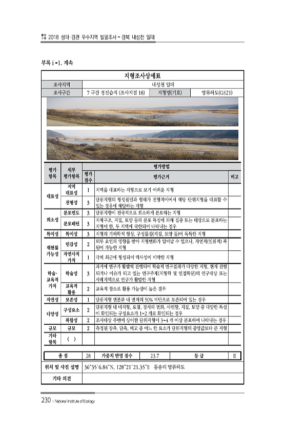 2018 생태·경관 우수지역 발굴조사 경북 내성천 일대 230 ? National Institute of Ecology 지형조사상세표 조사지역 내성천 일대 조사구간 7 구간 경진습지 조사지점 18 지형명 기호 망류하도 GS21 평가 항목 세부 평가항목 평가방법 평가 점수 평가근거 비고 대표성 지역 대표성 1 지역을 대표하는 지형으로 보기 어려운 지형 전형성 3 단위지형의 형성원인과 형태가 전형적이어서 해당 단위지형을 대표할 수 있는 경우에 해당하는 지형 희소성 분포빈도 3 단위지형이 전국적으로 희소하게 분포하는 지형 분포패턴 3 지체구조, 지질, 토양 등의 분포 특성에 의해 집중 또는 대상으로 분포하는 지형이 한, 두 지역에 국한되어 나타나는 경우 특이성 특이성 3 지형의 기하학적 형상, 구성물질 지질, 토...