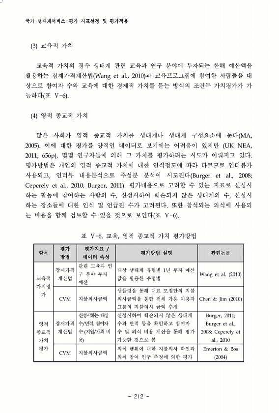 국가 생태계서비스 평가 지표선정 및 평가적용 212 3 교육적 가치 교육적 가치의 경우 생태계 관련 교육과 연구 분야에 투자되는 한해 예산액을 활용하는 잠재가격계산법 Wang et al., 2010 과 교육프로그램에 참여한 사람들을 대 상으로 참여자 수와 교육에 대한 경제적 가치를 묻는 방식의 조건부 가치평가가 가 능하다 표 Ⅴ 6 4 영적 종교적 가치 많은 사회가 영적 종교적 가치를 생태계나 생태계 구성요소에 둔다 MA, 2005 이에 대한 평가를 양적인 데이터로 보기에는 어려움이 있지만 UK NEA, 2011, 656p , 몇몇 연구자들에 의해 그 가치를 평가하려는 시도가 이뤄지고 있다. 평가방법은 개인의 영적 종교적 가치에 대한 인식정도에 따라 다르므로 인터뷰가 사용되고, 인터뷰 내용분석으로 주성분 분...