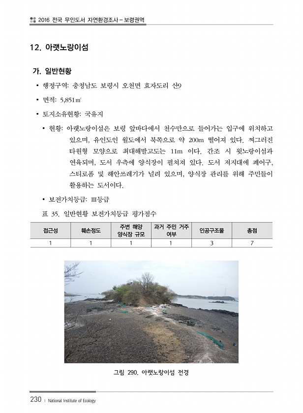 2016 전국 무인도서 자연환경조사 보령권역 230 ? National Institute of Ecology 12. 아랫노랑이섬 가. 일반현황 ? 행정구역충청남도 보령시 오천면 효자도리 산9 ? 면적5,851㎡ ? 토지소유현황국유지 ? 현황아랫노랑이섬은 보령 앞바다에서 천수만으로 들어가는 입구에 위치하고 있으며, 유인도인 월도에서 북쪽으로 약 200m 떨어져 있다. 찌그러진 타원형 모양으로 최대해발고도는 11m 이다. 간조 시 윗노랑이섬과 연육되며, 도서 우측에 양식장이 펼쳐져 있다. 도서 저지대에 폐어구, 스티로폼 및 해안쓰레기가 널려 있으며, 양식장 관리를 위해 주민들이 활용하는 도서이다. ? 보전가치등급Ⅲ등급 표 35. 일반현황 보전가치등급 평가점수 접근성 훼손정도 주변 해양 양식장 규모 과거 주민 거...