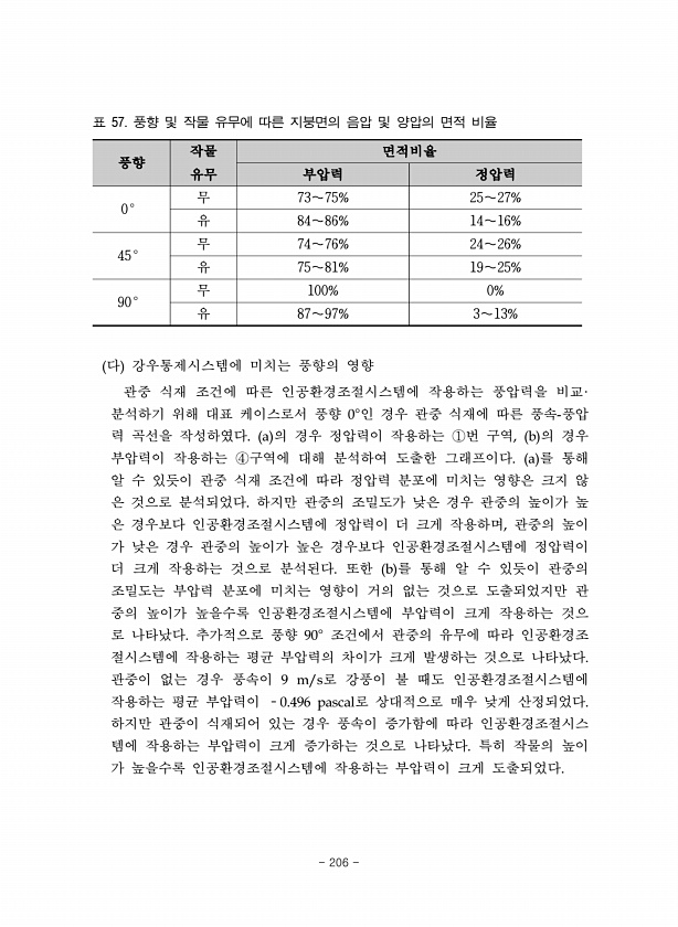 풍향 작물 유무 면적비율 부압력 정압력 0° 무 73∼75% 25∼27% 유 84∼86% 14∼16% 45° 무 74∼76% 24∼26% 유 75∼81% 19∼25% 90° 무 100% 0% 유 87∼97% 3∼13% 표 57. 풍향 및 작물 유무에 따른 지붕면의 음압 및 양압의 면적 비율 다 강우통제시스템에 미치는 풍향의 영향 관중 식재 조건에 따른 인공환경조절시스템에 작용하는 풍압력을 비교· 분석하기 위해 대표 케이스로서 풍향 0°인 경우 관중 식재에 따른 풍속-풍압 력 곡선을 작성하였다. a 의 경우 정압력이 작용하는 ①번 구역, b 의 경우 부압력이 작용하는 ④구역에 대해 분석하여 도출한 그래프이다. a 를 통해 알 수 있듯이 관중 식재 조건에 따라 정압력 분포에 미치는 영향은 크지 않 은 것으로 분...