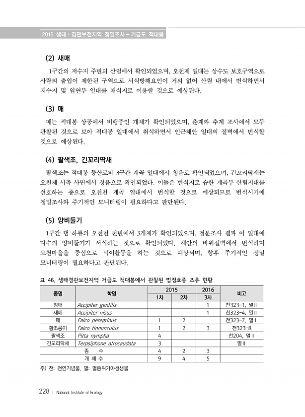 2015 생태·경관보전지역 정밀조사 거금도 적대봉 228 ? National Institute of Ecology 2 새매 1구간의 저수지 주변의 산림에서 확인되었으며, 오천제 일대는 상수도 보호구역으로 사람의 출입이 제한된 구역으로 서식방해요인이 거의 없어 산림 내에서 번식하면서 저수지 및 임연부 일대를 채식지로 이용할 것으로 예상된다. 3 매 매는 적대봉 상공에서 비행중인 개체가 확인되었으며, 춘계와 추계 조사에서 모두 관찰된 것으로 보아 적대봉 일대에서 취식하면서 인근해안 일대의 절벽에서 번식할 것으로 예상된다. 4 팔색조, 긴꼬리딱새 팔색조는 적대봉 등산로와 3구간 계곡 일대에서 청음로 확인되었으며, 긴꼬리딱새는 오천제 서측 사면에서 청음으로 확인되었다. 이들은 번식지로 습한 계곡부 산림지대를 선호하...