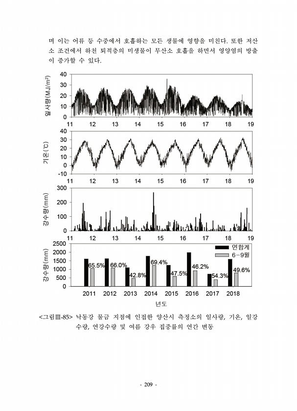 209 며 이는 어류 등 수중에서 호흡하는 모든 생물에 영향을 미친다. 또한 저산 소 조건에서 하천 퇴적층의 미생물이 무산소 호흡을 하면서 영양염의 방출 이 증가할 수 있다. 그림Ⅲ-85 낙동강 물금 지점에 인접한 양산시 측정소의 일사량, 기온, 일강 수량, 연강수량 및 여름 강우 집중률의 연간변동