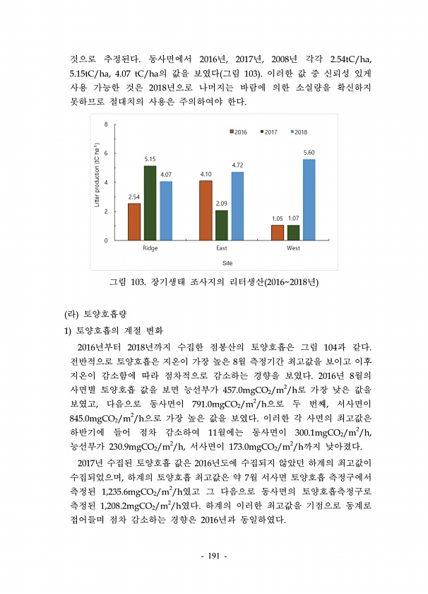 191 것으로 추정된다. 동사면에서 2016년, 2017년, 2008년 각각 2.54tC/ha, 5.15tC/ha, 4.07 tC/ha의 값을 보였다 그림 103 이러한 값 중 신뢰성 있게 사용 가능한 것은 2018년으로 나머지는 바람에 의한 소실량을 확신하지 못하므로 절대치의 사용은 주의하여야 한다. 그림 103. 장기생태 조사지의 리터생산 20162018년 라 토양호흡량 1 토양호흡의 계절 변화 2016년부터 2018년까지 수집한 점봉산의 토양호흡은 그림 104과 같다. 전반적으로 토양호흡은 지온이 가장 높은 8월 측정기간 최고값을 보이고 이후 지온이 감소함에 따라 점차적으로 감소하는 경향을 보였다. 2016년 8월의 사면별 토양호흡 값을 보면 능선부가 457.0mgCO2/m2/h로 가장 낮은 값을 보였...