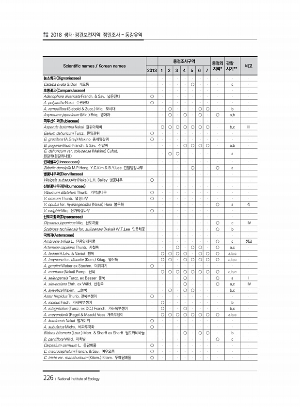 2018 생태·경관보전지역 정밀조사 동강유역 226 ? National Institute of Ecology Scientific names Korean names 중점조사구역 중점외 지역* 관찰 2013 1 2 3 4 5 6 7 시기** 비고 능소화과 Bignoniaceae Catalpa ovata G.Don 개오동 ○ c 초롱꽃과 Campanulaceae Adenophora divaricata Franch. & Sav. 넓은잔대 ○ A. polyantha Nakai 수원잔대 ○ A. remotiflora Siebold & Zucc. Miq. 모시대 ○ ○ ○ b Asyneuma ...