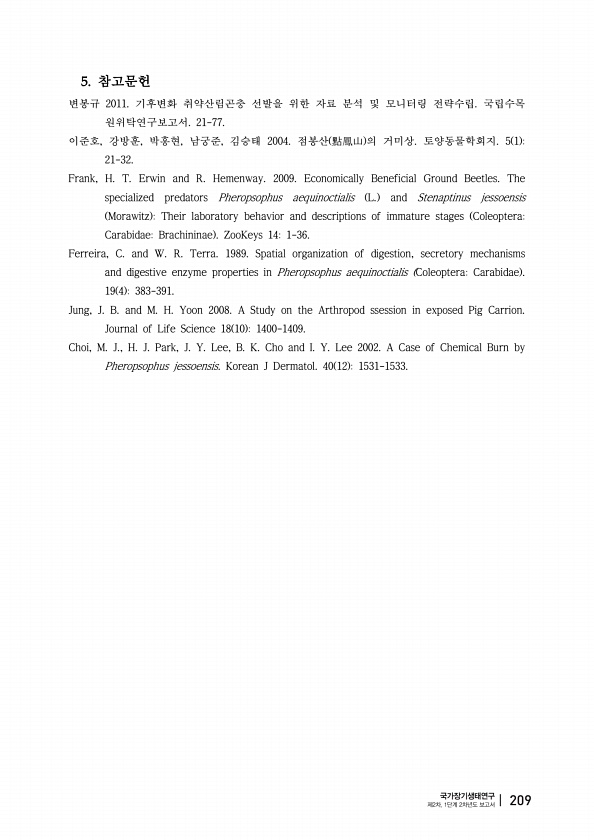 참고문헌 변봉규 2011. 기후변화 취약산림곤충 선발을 위한 자료 분석 및 모니터링 전략수립. 국립수목 원위탁연구보고서. 21-77. 이준호, 강방훈, 박홍현, 남궁준, 김승태 2004. 점봉산 點鳳山 의 거미상. 토양동물학회지. 5 1 21-32. Frank, H. T. Erwin and R. Hemenway. 2009. Economically Beneficial Ground Beetles. The specialized predators Pheropsophus aequinoctialis L. and Stenaptinus jessoensis Morawitz Their laboratory behavior and descriptions of immature stages ColeopteraCarabidaeBrac...