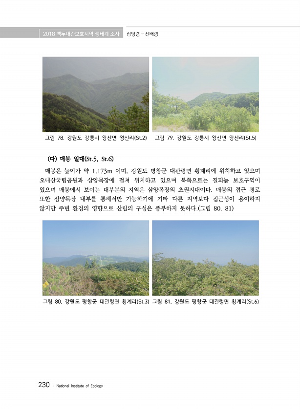 2018 백두대간보호지역 생태계 조사 삽당령 신배령 230 ? National Institute of Ecology 그림 78. 강원도 강릉시 왕산면 왕산리 St.2 그림 79. 강원도 강릉시 왕산면 왕산리 St.5 다 매봉 일대 St.5, St.6 매봉은 높이가 약 1,173m 이며, 강원도 평창군 대관령면 횡계리에 위치하고 있으며 오대산국립공원과 삼양목장에 걸쳐 위치하고 있으며 북쪽으로는 질뫼늪 보호구역이 있으며 매봉에서 보이는 대부분의 지역은 삼양목장의 초원지대이다. 매봉의 접근 경로 또한 삼양목장 내부를 통해서만 가능하기에 기타 다른 지역보다 접근성이 용이하지 않지만 주변 환경의 영향으로 산림의 구성은 풍부하지 못하다. 그림 80, 81 그림 80. 강원도 평창군 대관령면 횡계리 St.3 그림 81....