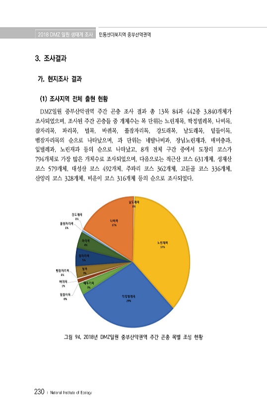 2018 DMZ 일원 생태계 조사 민통선이북지역 중부산악권역 230 ? National Institute of Ecology 3. 조사결과 가. 현지조사 결과 1 조사지역 전체 출현 현황 DMZ일원 중부산악권역 주간 곤충 조사 결과 총 13목 84과 442종 3,840개체가 조사되었으며, 조사된 주간 곤충들 중 개체수는 목 단위는 노린재목, 딱정벌레목, 나비목, 잠자리목, 파리목, 벌목, 바퀴목, 풀잠자리목, 강도래목, 날도래목, 밑들이목, 뱀잠자리목의 순으로 나타났으며, 과 단위는 네발나비과, 장님노린재과, 매미충과, 잎벌레과, 노린재과 등의 순으로 나타났고, 8개 전체 구간 중에서 도창리 코스가 794개체로 가장 많은 개체수로 조사되었으며, 다음으로는 적근산 코스 631개체, 성재산 코스 579개체, 대...